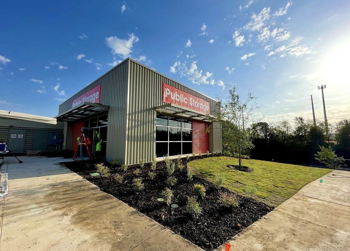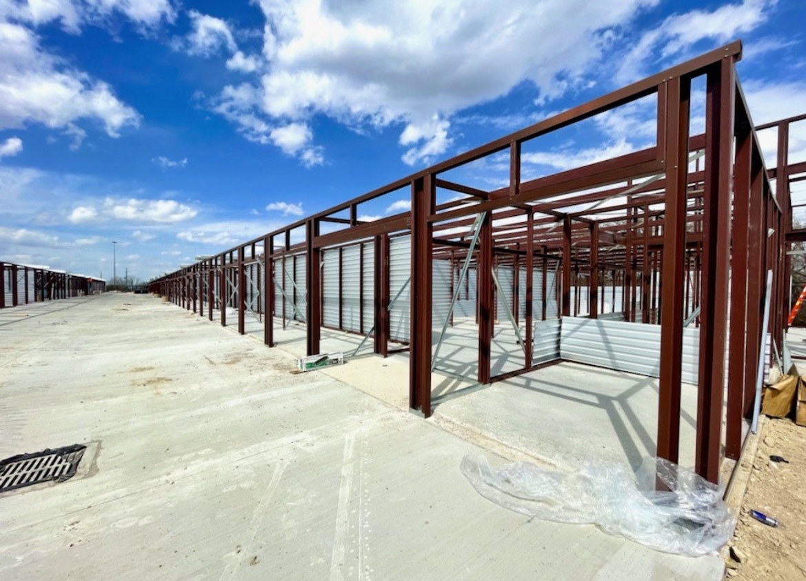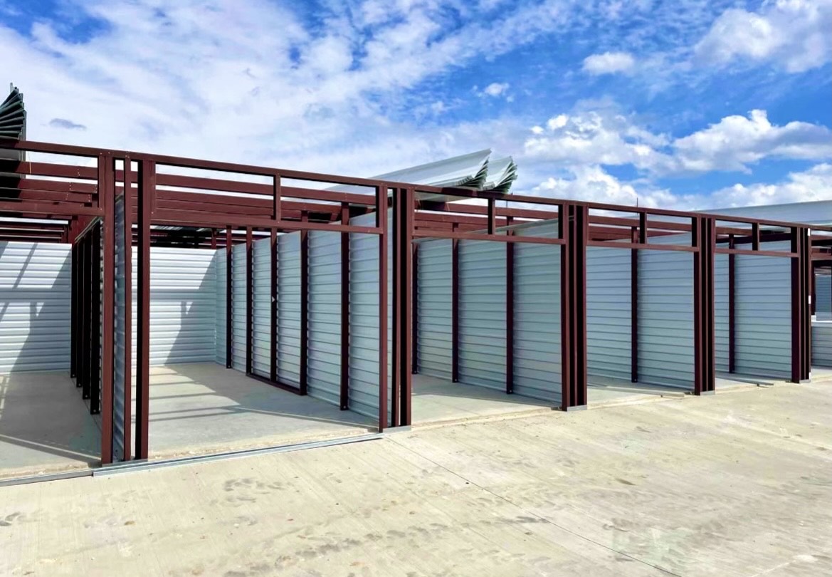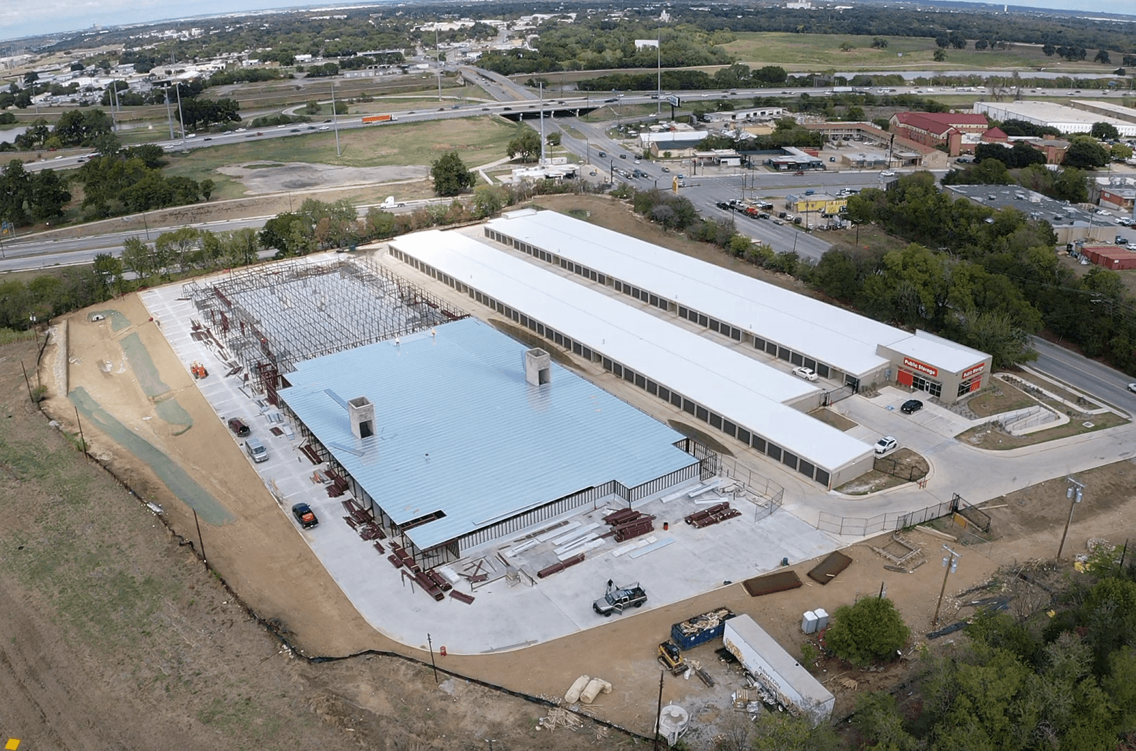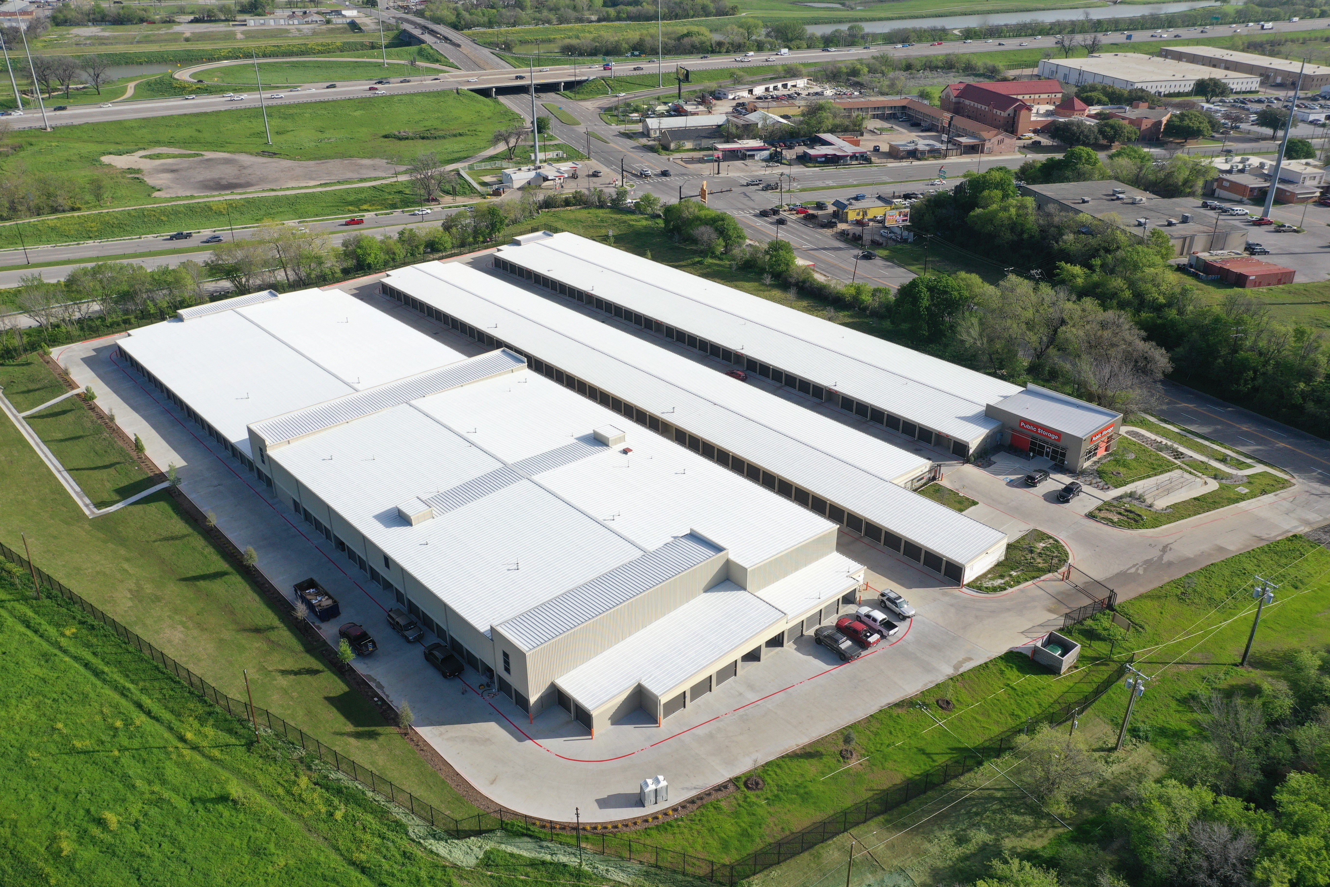 Modern commercial facility featuring clean architectural lines, metal panel siding, and a bold red entry feature. The property includes secure gated access, covered drive aisles, and efficient site circulation, all positioned within a major industrial corridor with the Dallas skyline in the distance. Built for durability, functionality, and long-term performance.